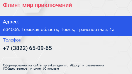 Флинт, мир приключений по адресу 634006, Томская область, Томск, Транспортная, 1а в дальнейшем Организация, размещена в следующих категориях: