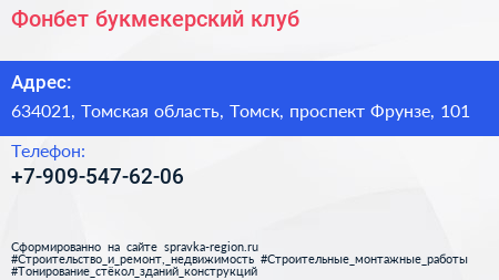 Фонбет, букмекерский клуб по адресу 634021, Томская область, Томск, проспект Фрунзе, 101 в дальнейшем Организация, размещена в следующих категориях: