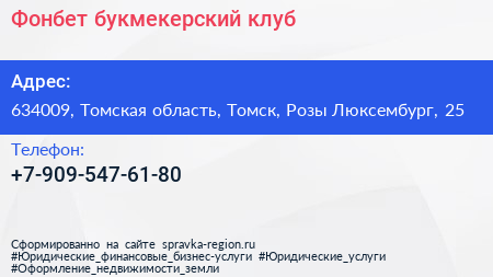 Фонбет, букмекерский клуб по адресу 634009, Томская область, Томск, Розы Люксембург, 25 в дальнейшем Организация, размещена в следующих категориях: