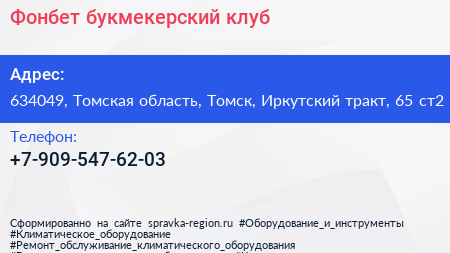 Фонбет, букмекерский клуб по адресу 634049, Томская область, Томск, Иркутский тракт, 65 ст2 в дальнейшем Организация, размещена в следующих категориях: