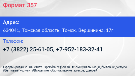Формат 357 по адресу 634041, Томская область, Томск, Вершинина, 17г в дальнейшем Организация, размещена в следующих категориях: