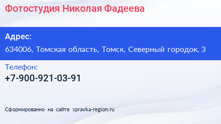 Фотостудия Николая Фадеева по адресу 634006, Томская область, Томск, Северный городок, 3 в дальнейшем Организация, размещена в следующих категориях: