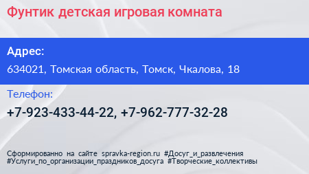 Фунтик, детская игровая комната по адресу 634021, Томская область, Томск, Чкалова, 18 в дальнейшем Организация, размещена в следующих категориях:
