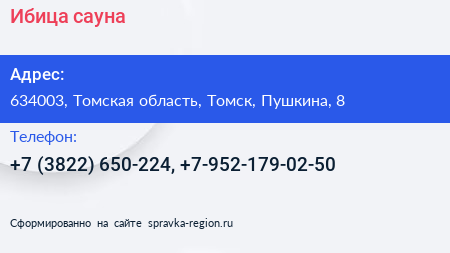 Ибица, сауна по адресу 634003, Томская область, Томск, Пушкина, 8 в дальнейшем Организация, размещена в следующих категориях: