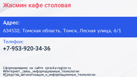 Жасмин, кафе-столовая по адресу 634532, Томская область, Томск, Лесная улица, 6/1 в дальнейшем Организация, размещена в следующих категориях:
