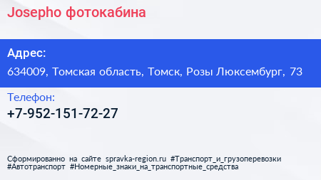 Josepho, фотокабина по адресу 634009, Томская область, Томск, Розы Люксембург, 73 в дальнейшем Организация, размещена в следующих категориях: