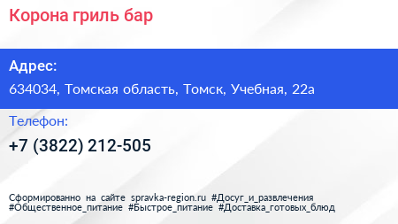 Корона, гриль-бар по адресу 634034, Томская область, Томск, Учебная, 22а в дальнейшем Организация, размещена в следующих категориях: