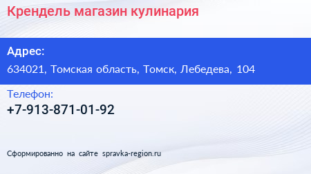 Крендель, магазин-кулинария по адресу 634021, Томская область, Томск, Лебедева, 104 в дальнейшем Организация, размещена в следующих категориях: