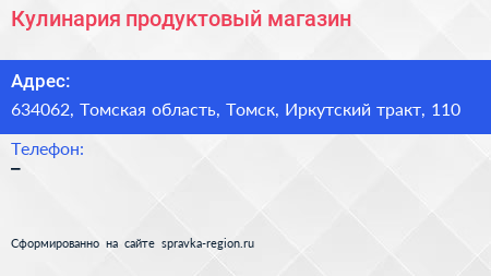 Кулинария, продуктовый магазин по адресу 634062, Томская область, Томск, Иркутский тракт, 110 в дальнейшем Организация, размещена в следующих категориях: