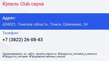 Купель Club, сауна по адресу 634021, Томская область, Томск, Шевченко, 14 в дальнейшем Организация, размещена в следующих категориях: