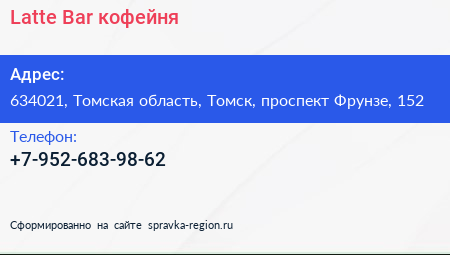 Latte Bar, кофейня по адресу 634021, Томская область, Томск, проспект Фрунзе, 152 в дальнейшем Организация, размещена в следующих категориях:
