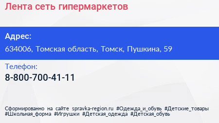 Лента, сеть гипермаркетов по адресу 634006, Томская область, Томск, Пушкина, 59 в дальнейшем Организация, размещена в следующих категориях: