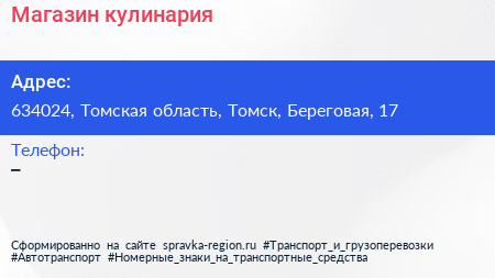 Магазин-кулинария по адресу 634024, Томская область, Томск, Береговая, 17 в дальнейшем Организация, размещена в следующих категориях: