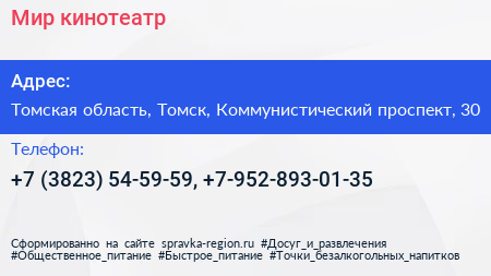 Мир, кинотеатр по адресу Томская область, Томск, Коммунистический проспект, 30 в дальнейшем Организация, размещена в следующих категориях: