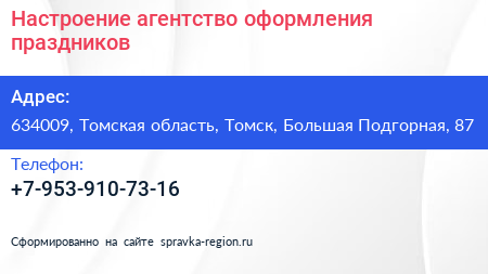 Настроение, агентство оформления праздников по адресу 634009, Томская область, Томск, Большая Подгорная, 87 в дальнейшем Организация, размещена в следующих категориях: