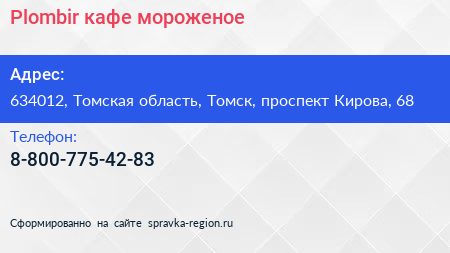 Plombir, кафе-мороженое по адресу 634012, Томская область, Томск, проспект Кирова, 68 в дальнейшем Организация, размещена в следующих категориях:
