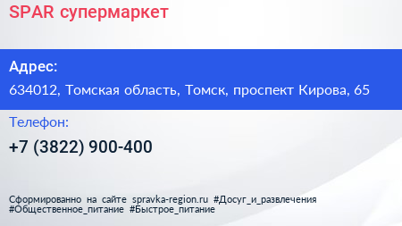 SPAR, супермаркет по адресу 634012, Томская область, Томск, проспект Кирова, 65 в дальнейшем Организация, размещена в следующих категориях: