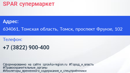 SPAR, супермаркет по адресу 634061, Томская область, Томск, проспект Фрунзе, 102 в дальнейшем Организация, размещена в следующих категориях: