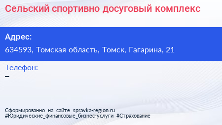 Сельский спортивно-досуговый комплекс по адресу 634593, Томская область, Томск, Гагарина, 21 в дальнейшем Организация, размещена в следующих категориях:
