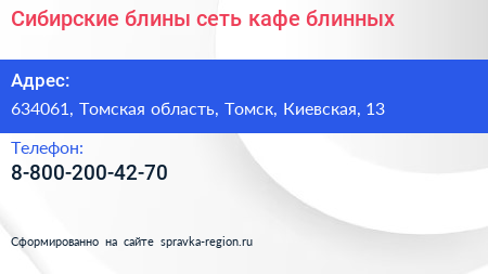 Сибирские блины, сеть кафе-блинных по адресу 634061, Томская область, Томск, Киевская, 13 в дальнейшем Организация, размещена в следующих категориях: