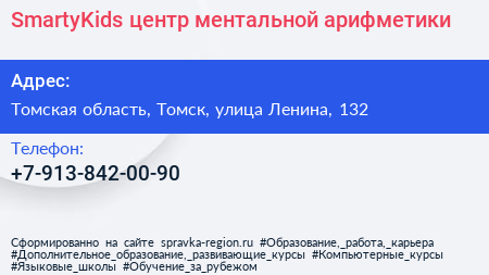 SmartyKids, центр ментальной арифметики по адресу Томская область, Томск, улица Ленина, 132 в дальнейшем Организация, размещена в следующих категориях: