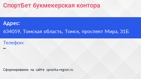 СпортБет, букмекерская контора по адресу 634059, Томская область, Томск, проспект Мира, 31Б в дальнейшем Организация, размещена в следующих категориях: