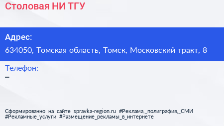 Столовая, НИ ТГУ по адресу 634050, Томская область, Томск, Московский тракт, 8 в дальнейшем Организация, размещена в следующих категориях:
