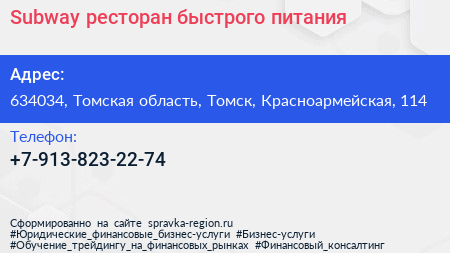 Subway, ресторан быстрого питания по адресу 634034, Томская область, Томск, Красноармейская, 114 в дальнейшем Организация, размещена в следующих категориях: