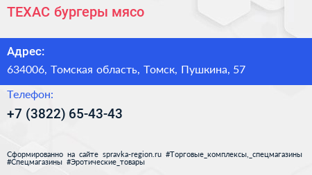 ТЕХАС бургеры & мясо по адресу 634006, Томская область, Томск, Пушкина, 57 в дальнейшем Организация, размещена в следующих категориях: