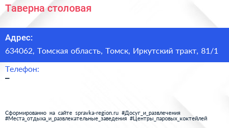 Таверна, столовая по адресу 634062, Томская область, Томск, Иркутский тракт, 81/1 в дальнейшем Организация, размещена в следующих категориях: