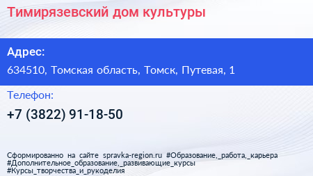 Тимирязевский, дом культуры по адресу 634510, Томская область, Томск, Путевая, 1 в дальнейшем Организация, размещена в следующих категориях: