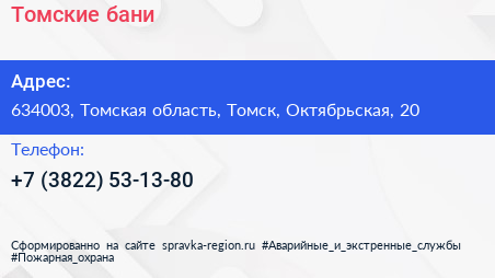 Томские бани по адресу 634003, Томская область, Томск, Октябрьская, 20 в дальнейшем Организация, размещена в следующих категориях: