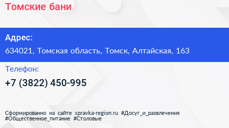 Томские бани по адресу 634021, Томская область, Томск, Алтайская, 163 в дальнейшем Организация, размещена в следующих категориях: