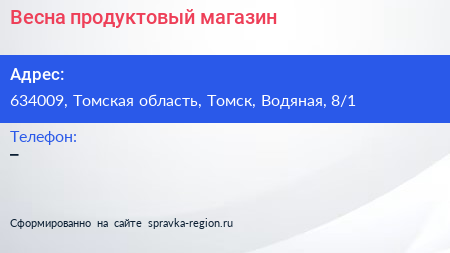 Весна, продуктовый магазин по адресу 634009, Томская область, Томск, Водяная, 8/1 в дальнейшем Организация, размещена в следующих категориях: