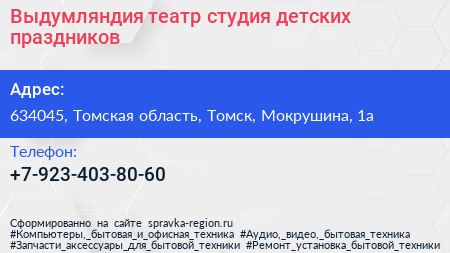 Выдумляндия, театр-студия детских праздников по адресу 634045, Томская область, Томск, Мокрушина, 1а в дальнейшем Организация, размещена в следующих категориях: