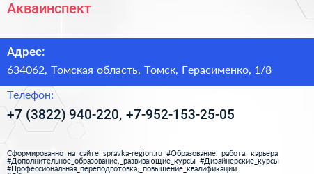 Акваинспект по адресу 634062, Томская область, Томск, Герасименко, 1/8 в дальнейшем Организация, размещена в следующих категориях: