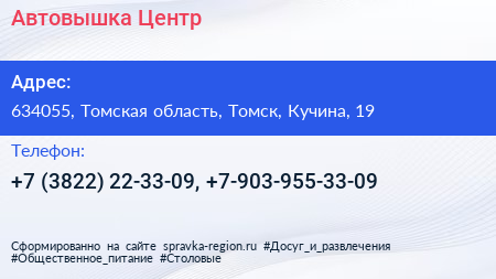 Автовышка-Центр по адресу 634055, Томская область, Томск, Кучина, 19 в дальнейшем Организация, размещена в следующих категориях: