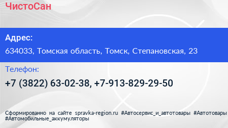 ЧистоСан по адресу 634033, Томская область, Томск, Степановская, 23 в дальнейшем Организация, размещена в следующих категориях: