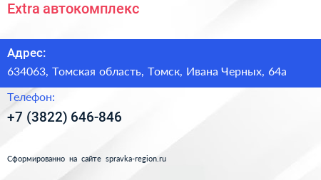 Extra, автокомплекс по адресу 634063, Томская область, Томск, Ивана Черных, 64а в дальнейшем Организация, размещена в следующих категориях: