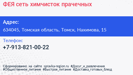 ФЕЯ, сеть химчисток-прачечных по адресу 634045, Томская область, Томск, Нахимова, 15 в дальнейшем Организация, размещена в следующих категориях: