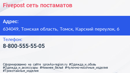 Fivepost, сеть постаматов по адресу 634049, Томская область, Томск, Карский переулок, 6 в дальнейшем Организация, размещена в следующих категориях: