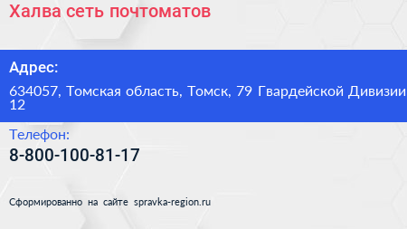 Халва, сеть почтоматов по адресу 634057, Томская область, Томск, 79 Гвардейской Дивизии, 12 в дальнейшем Организация, размещена в следующих категориях: