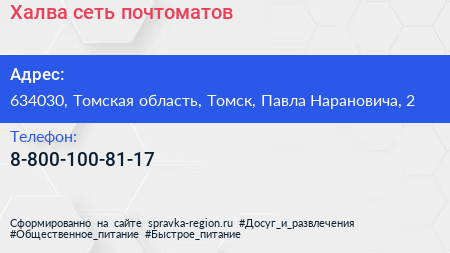 Халва, сеть почтоматов по адресу 634030, Томская область, Томск, Павла Нарановича, 2 в дальнейшем Организация, размещена в следующих категориях: