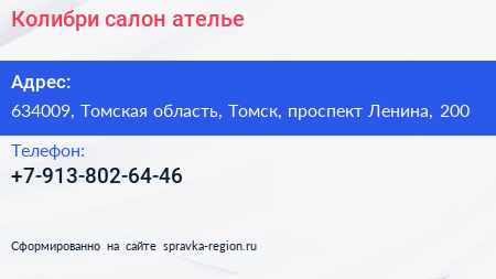 Колибри, салон-ателье по адресу 634009, Томская область, Томск, проспект Ленина, 200 в дальнейшем Организация, размещена в следующих категориях:
