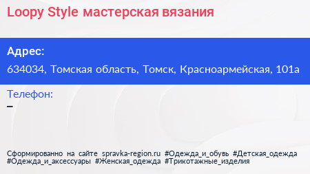 Loopy Style, мастерская вязания по адресу 634034, Томская область, Томск, Красноармейская, 101а в дальнейшем Организация, размещена в следующих категориях: