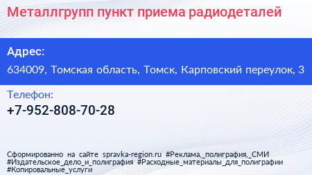 Металлгрупп, пункт приема радиодеталей по адресу 634009, Томская область, Томск, Карповский переулок, 3 в дальнейшем Организация, размещена в следующих категориях: