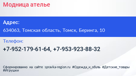 Модница, ателье по адресу 634063, Томская область, Томск, Беринга, 10 в дальнейшем Организация, размещена в следующих категориях: