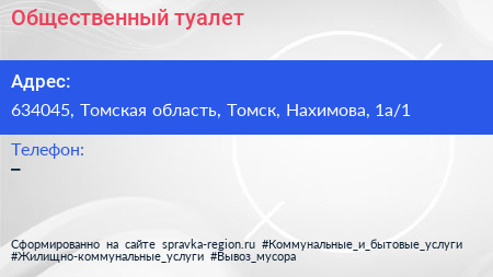 Общественный туалет по адресу 634045, Томская область, Томск, Нахимова, 1а/1 в дальнейшем Организация, размещена в следующих категориях: