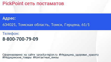 PickPoint, сеть постаматов по адресу 634021, Томская область, Томск, Герцена, 61/1 в дальнейшем Организация, размещена в следующих категориях: