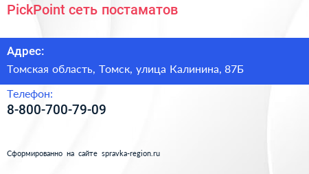 PickPoint, сеть постаматов по адресу Томская область, Томск, улица Калинина, 87Б в дальнейшем Организация, размещена в следующих категориях: